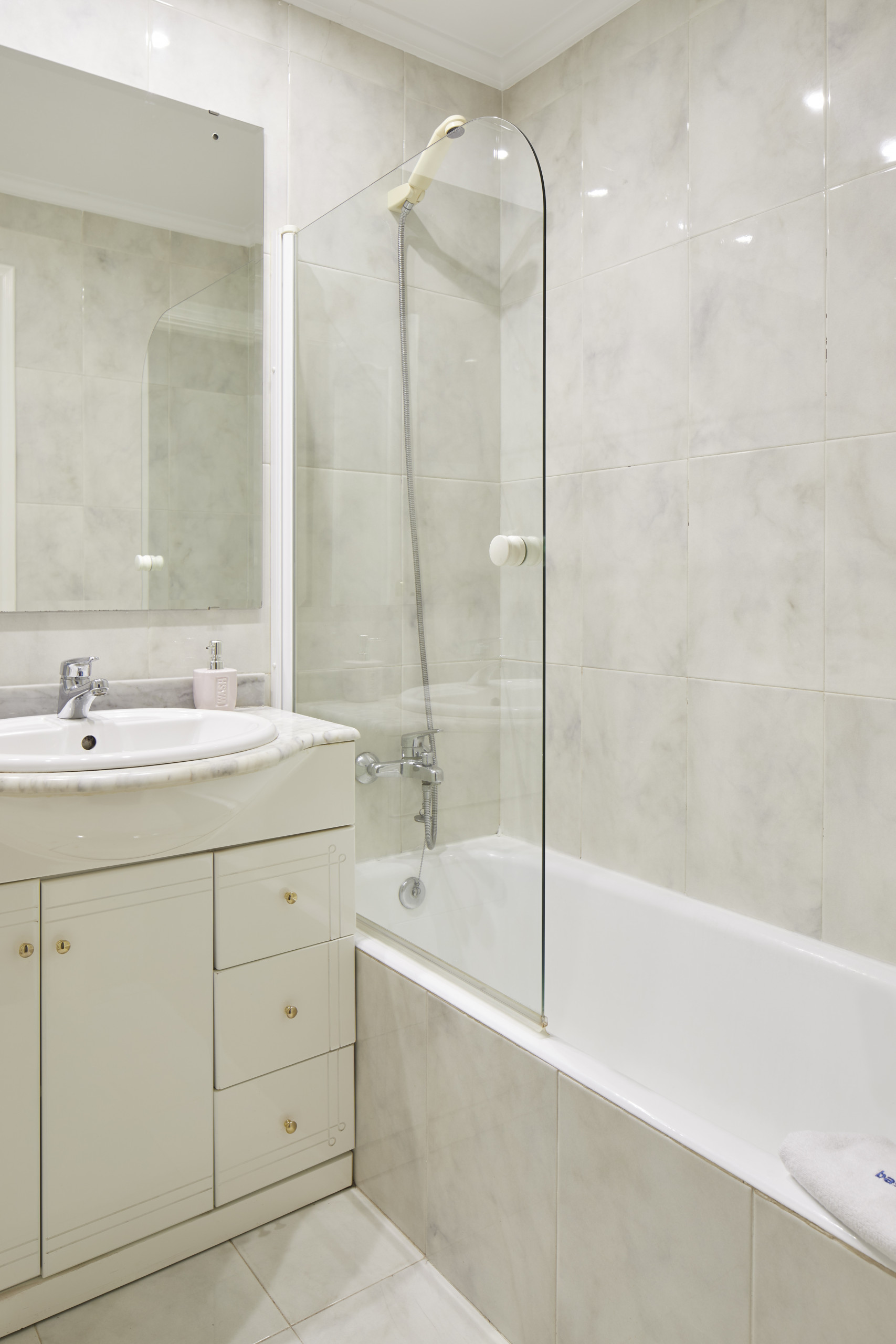 La salle de bain est équipée d'une baignoire, en plus du lavabo, des toilettes et du bidet.